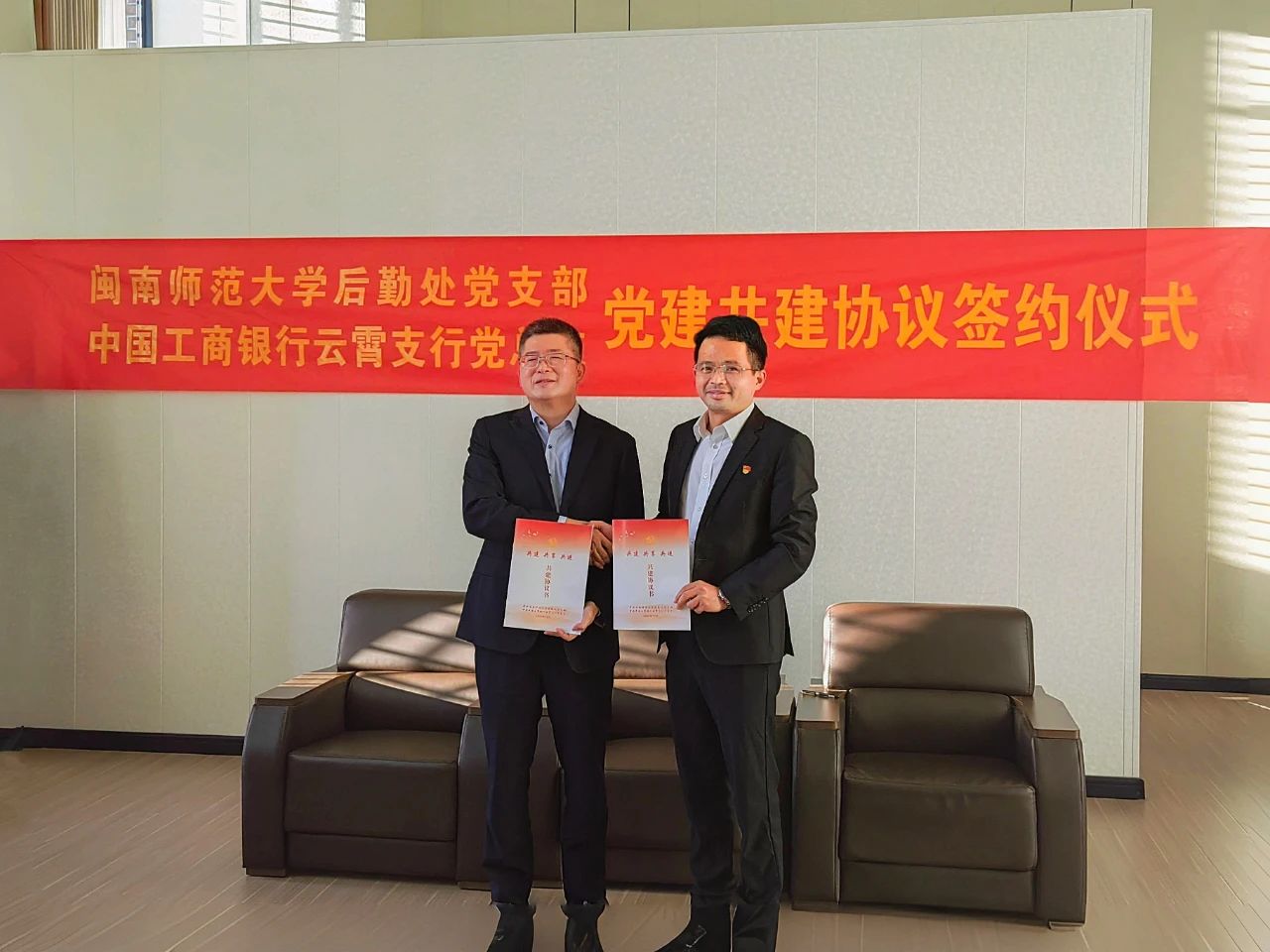 参观结束后,后勤处党支部书记方胜强、中国工商银行云霄支行党总支书记陈锡海签订《共建协议书》,明确了双方在构建党建共建机制、加强理论学习交流、以党建业务融合发展等方面的合作事项,并就下一步党建工作目标交换了意见。