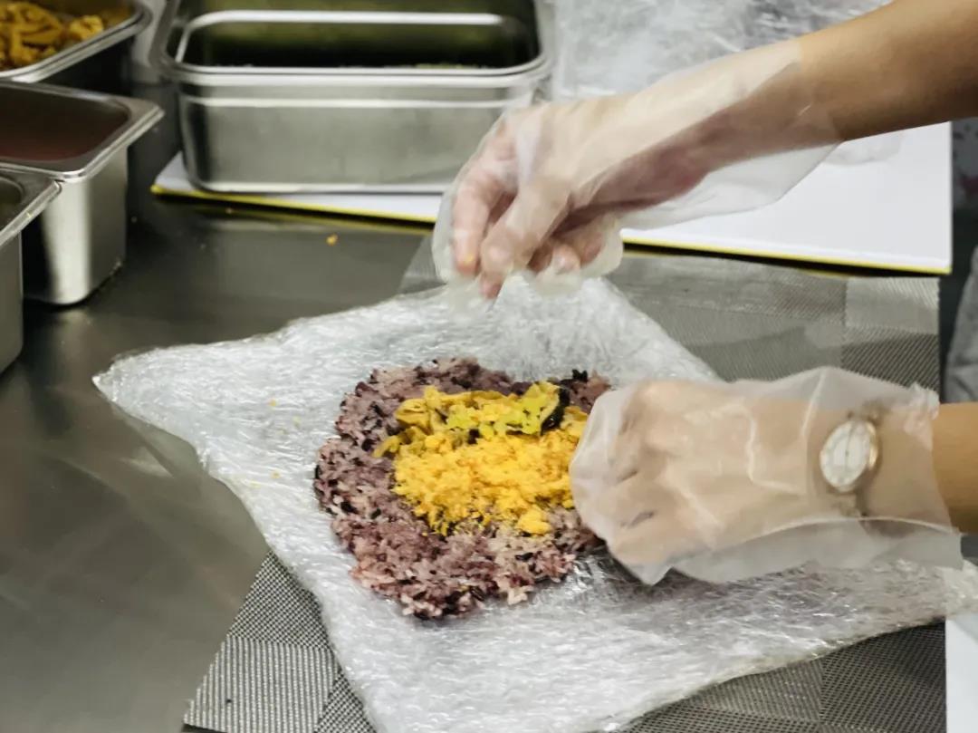 爆浆芝士饭团:油条+肉松+萝卜干+香菇+火腿肠+芝士+海苔