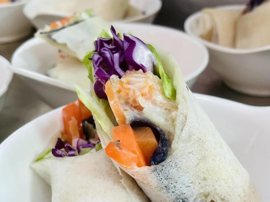 食材:春卷皮、西生菜、茄子、紫甘蓝、鸡柳、胡萝卜、沙拉酱。