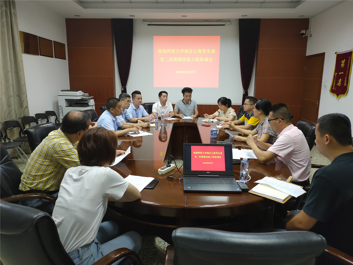 5月27日下午,后勤管理处在达理学生活动中心二楼会议室组织召开瑞京公寓学生食堂二次装修改造工程协调会。后勤管理处处长陈素红出席会议,中标企业(福州富强有限公司和福州聚誉有限公司)二次装修改造工程项目负责人以及后勤管理处有关科室负责人参加会议。
