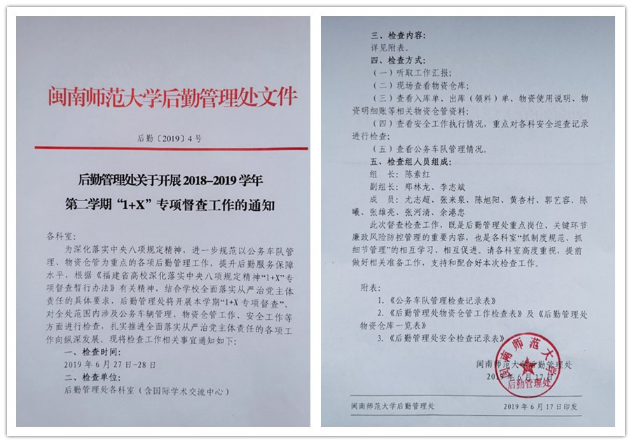 近日,为深化落实中央八项规定精神,进一步规范以公务车队管理、物资仓管为重点的各项后勤管理工作,提升后勤服务保障水平,根据《福建省高校深化落实中央八项规定精神“1+X”专项督查暂行办法》有关精神,结合学校全面落实从严治党主体责任的具体要求,后勤管理处将开展本学期“1+X专项督查”,对全处范围内涉及公务车辆管理、物资仓管工作、安全工作等方面进行检查,扎实推进全面落实从严治党主体责任的各项工作向纵深发展。