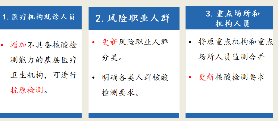加密风险职业人群核酸检测频次,将与入境人员、物品、环境直接接触的人员核酸检测调整为每天1次,对人员密集、接触人员频繁、流动性强的从业人员核酸检测调整为每周2次。