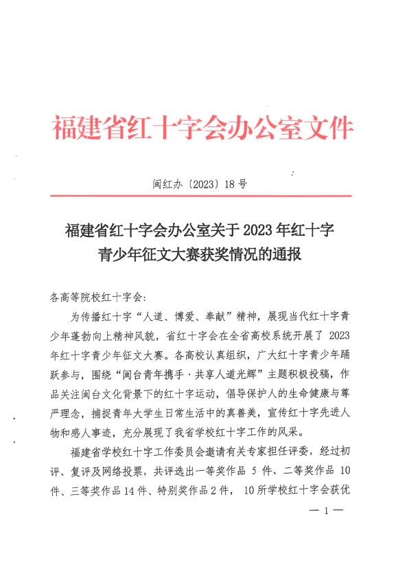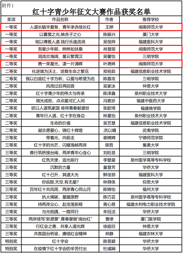 近日,福建省红十字青少年征文大赛圆满落下帷幕。我校在本次比赛中表现出色,取得佳绩。共获得两项一等奖,一项二等奖及优秀组织奖。