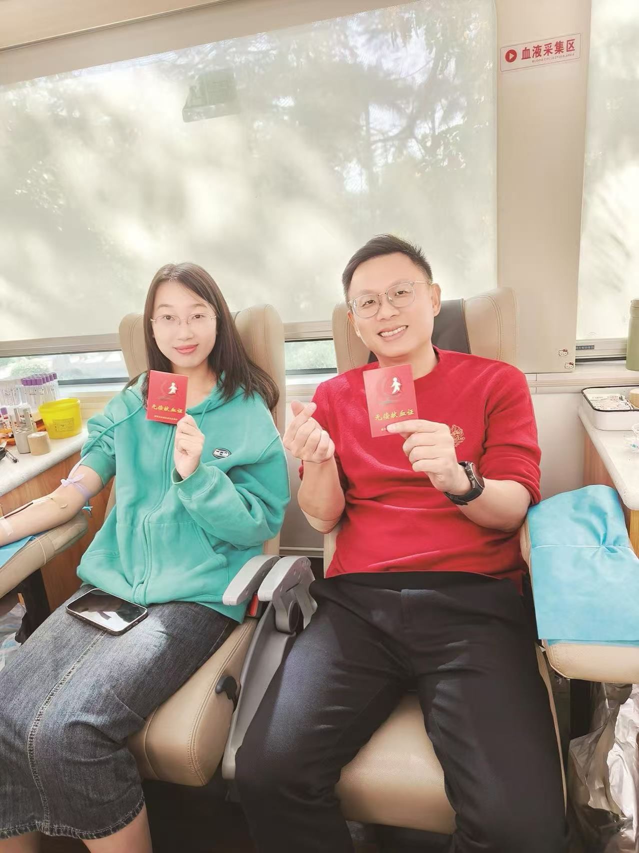 献血成功后的两位志愿者合影留念